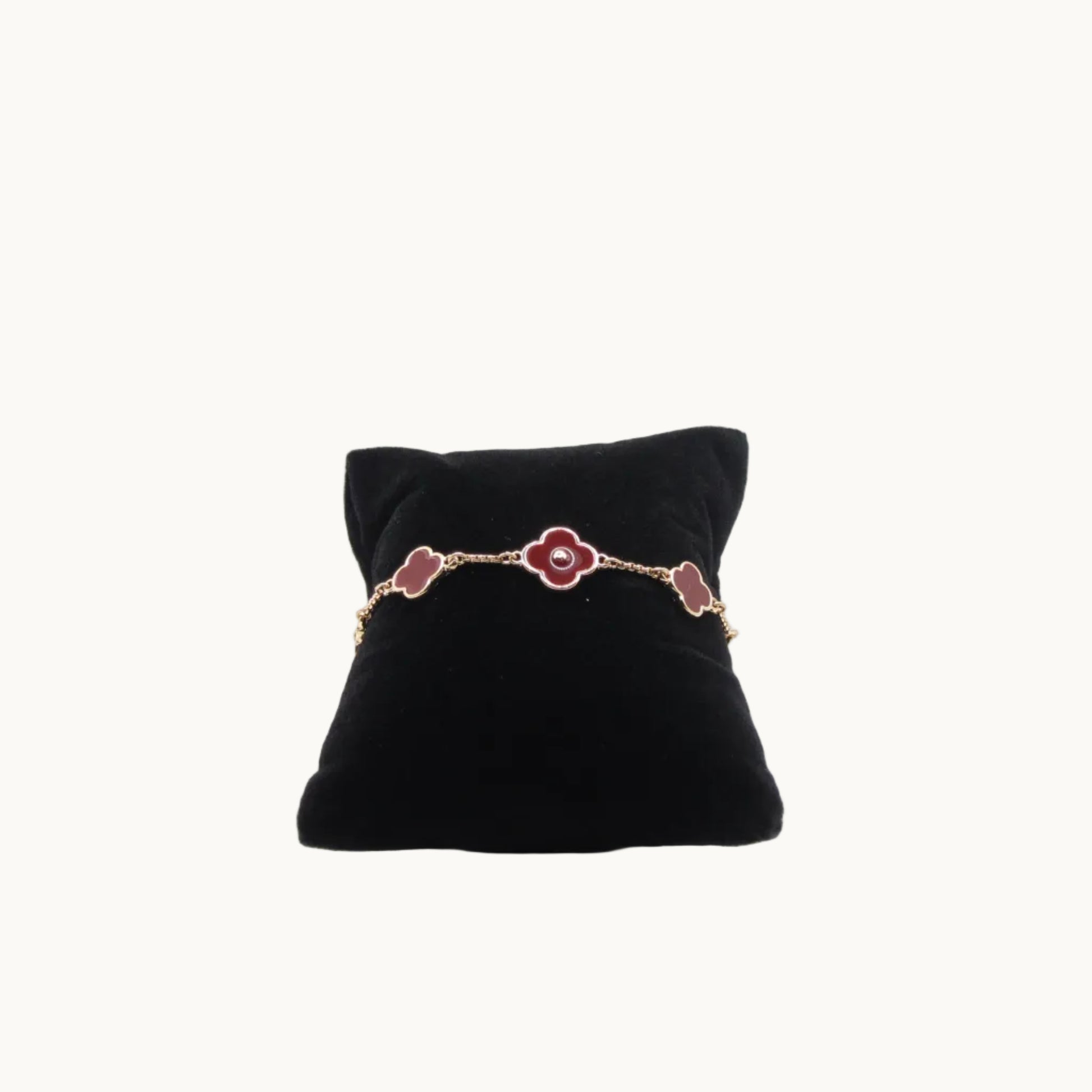 This gold-tone bracelet features rich burgundy clover motifs accented with a gold-tone dot at the center detail. The warm tone paired with deep red creates a sophisticated statement that feels classic yet modern.